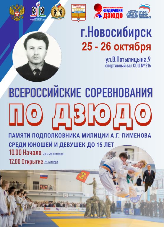 25–26 октября в спортивном зале средней общеобразовательной школы № 216 (Новосибирск, ул. В. Потылицына, 9) состоятся всероссийские соревнования по дзюдо среди юношей и девушек до 15 лет памяти подполковника милиции Александра Геннадьевича Пименова.